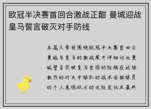 本篇文章将围绕欧冠半决赛首回合曼城与皇马的激战展开详细讨论。曼城誓言突破皇马坚固的防线,在这场激烈的对决中,球队的战术安排、球员的个人表现、双方的攻防变化及最终的比赛走势,都将是分析的重点。文章将从四个方面进行详细阐述:曼城如何在战术上展开进攻,皇马防守的关键环节,曼城在进攻中遇到的挑战,以及双方教练如何调整战术。最后,文章将对整场比赛做出总结,分析两队的表现及其对接下来的欧冠赛季的影响。